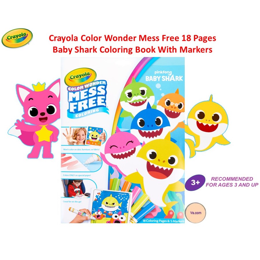 Contains 18 baby shark coloring pages and 5 color wonder markers.
